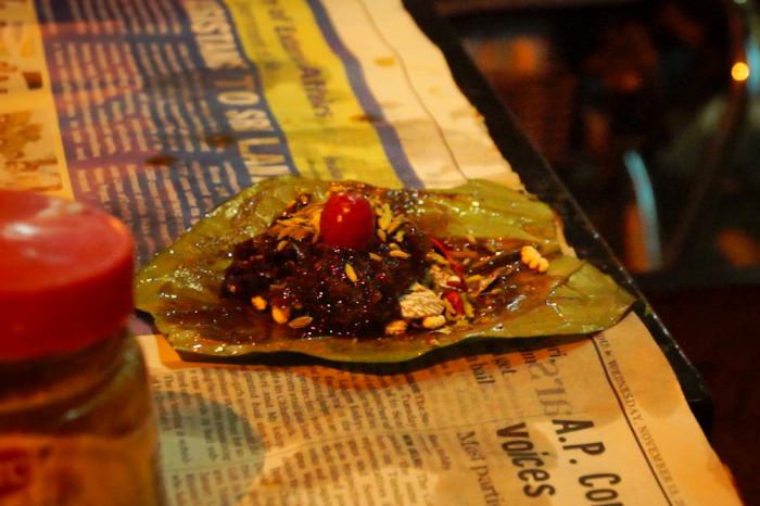 After the dinner, for the first time ever we tried Paan, which is betel nut wrapped in edible paan leaf alongside with mixture of spices and other "stuff". There are 2 types - sweet and with tobacco. Paan wallah (person who makes them), on question "is this sweet?" answered - "yes, see - tutti-frutti" and added some candy-like thingies. Watching whole making process was like a theater - so many ingredients and in the end - cherry on top. Cost - 15 rupees each. This was the sweetest thing I've ever tasted - like a sugar explosion in my mouth. You are supposed to chew it for quite a time. Too sweet. But I will definitely try it again.