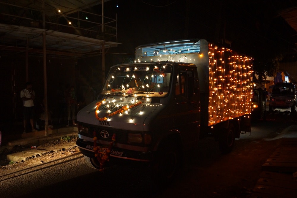 What you see here is crowd of dancing people in front of a moving car with disco-lights and music. Main car was followed by another which carried power generator to keep the music going (electricity shuts off randomly here).